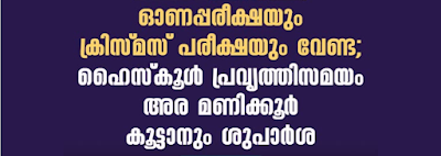 പഠനനിലവാരം ക്ലാസ് പരീക്ഷയിലൂടെ വിലയിരുത്താം. എല്പി, യുപി ക്ലാസ് സമയം കൂട്ടേണ്ടതില്ല. ഹൈസ്കൂളില് ദിവസവും അര മണിക്കൂര് കൂട്ടിയാല് വര്ഷത്തില് 1200 മണിക്കൂര് അദ്ധ്യയനം ഉറപ്പാക്കാം. സ്കൂള് ഇടവേളകള് പത്ത് മിനിട്ടാക്കണം.